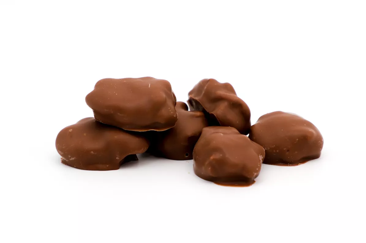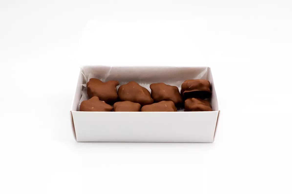 Gammy Mootz’s caramel recipe deposited on fresh roasted cashews, coated in our milk or dark chocolate.