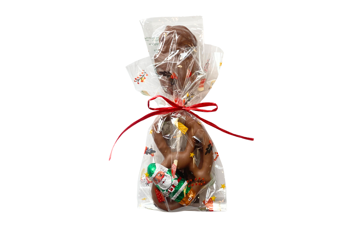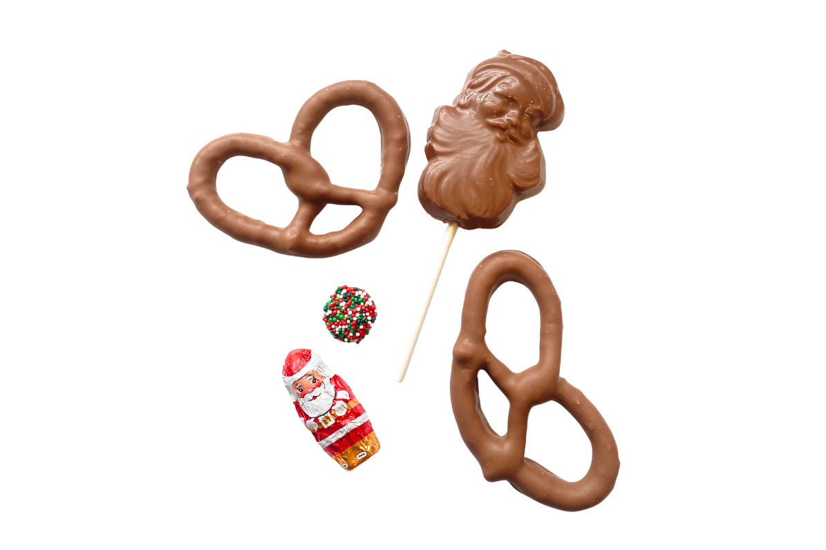 Our Christmas Goody Bag includes: A Milk Chocolate Christmas Pop, 2 Milk Chocolate Pretzels, 1 Milk Chocolate Non-Pareil and 1 Milk Chocolate Foil.