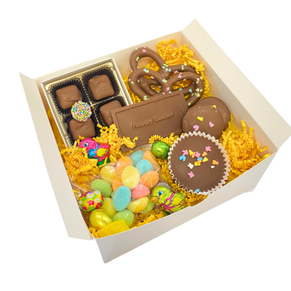 Ingredients: MAY CONTAIN SOME OR ALL OF THE FOLLOWING: Milk Chocolate (sugar, milk, cocoa butter, chocolate liquor, soy lecithin – an emulsifier, vanillin – an artificial flavor), Sugar, Peanut Butter, Corn Syrup, Peanuts, Coconut, Rasins, Evaporated Milk, Cocoa Butter, Sucrovert, Cherries, Butter, Cashews, Walnuts, Almonds, Pecans, Dates, Pineapple, Chocolate Liquor, Light Cream, Molasses, Egg Albumen, Palm Kernel Oil, Vanilla, Non-Fat Milk, Butterfat, Gelatin, Invert Sugar, Soy Lecithin, Starch, Wheat Flour, Vegetable Shortening, Malt, Sodium Bicarbonate, Yeast, Natural and Artificial Flavors, Artificial Color.