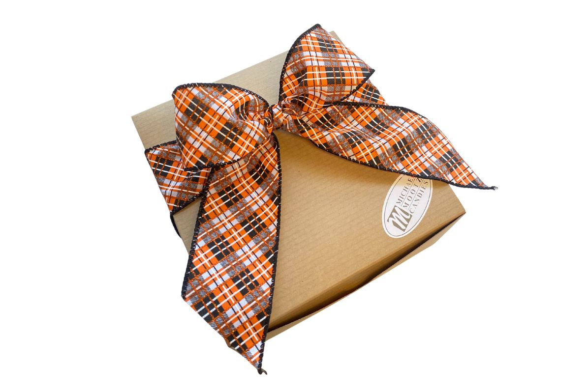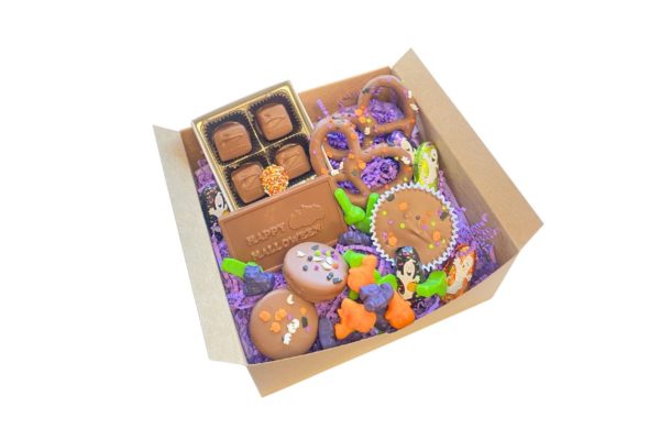 5 Milk Chocolate Halloween Foils, Milk Chocolate Large Peanut Butter Cup, 4pc. Box with Milk Chocolate Fluffernutters, 2 Pc. Milk Chocolate Pretzel, 2 Pc. Milk Chocolate Oreo, 1.5oz Milk Chocolate Greeting Bar and Spooktacular Mix Gummies. Items are packaged in cello bags and placed in box that has a festive bow.