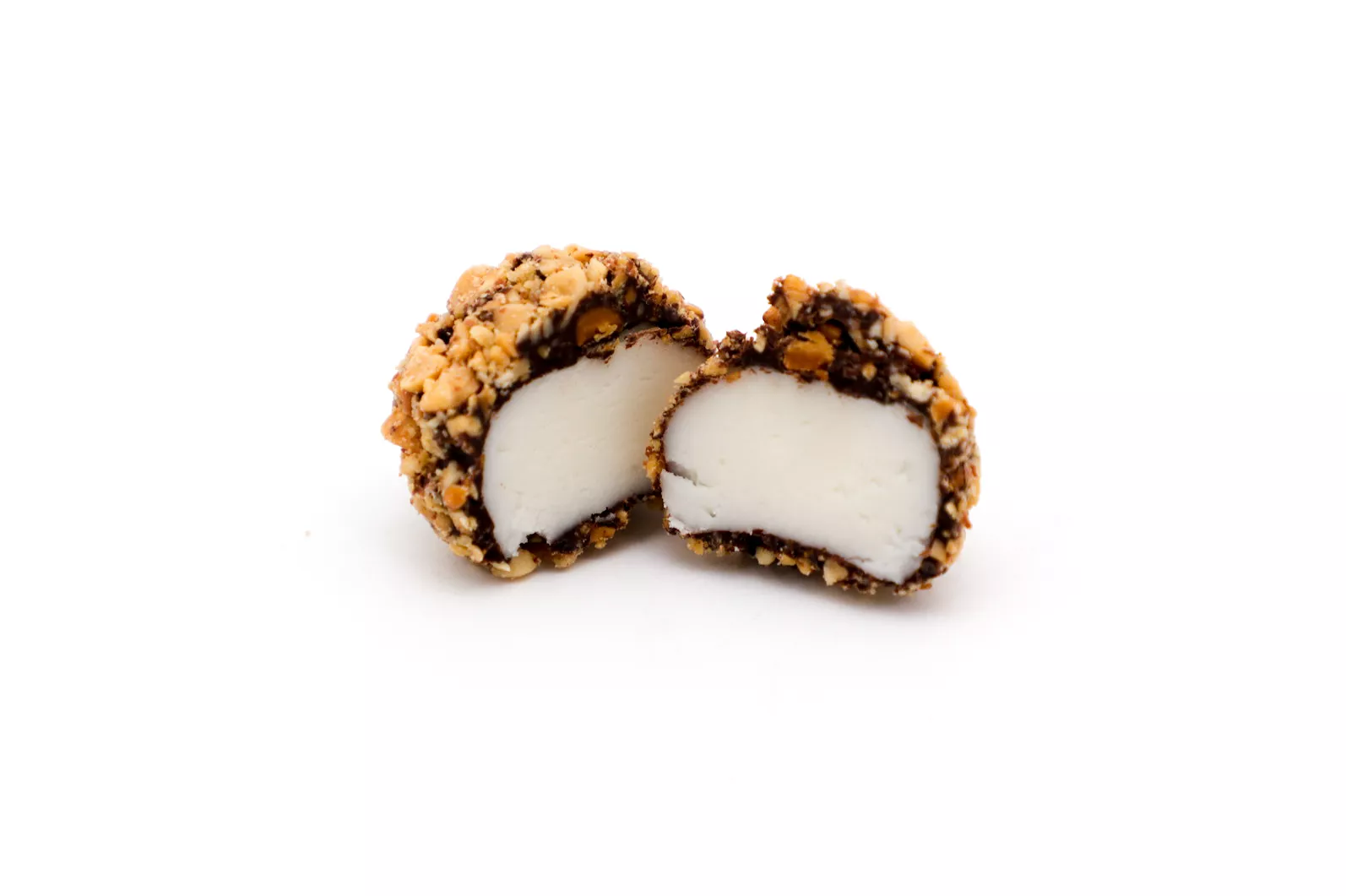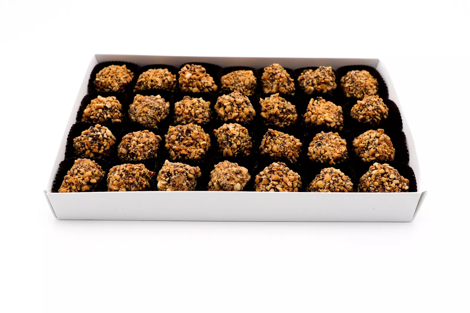 A truly unique piece. Our delicious Vanilla Butter Cream coated in luscious dark chocolate and then rolled in freshly ground peanuts.