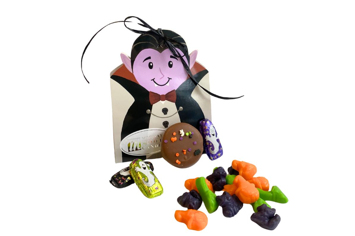 Box includes a single Milk Chocolate Oreo, 3oz. bag of Ghoulish Gummies, 3 Halloween Milk Chocolate Foils in an adorable little Vampire Box.